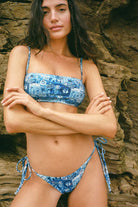 Your summer break bikini bottom is here, featuring cheeky coverage, glistening shine fabric, pink heart and star rhinestones, dainty string side ties, and our all new Alana Blue graphic print. Alana O'Herlihy designed this graphic print reminiscent of growing up in Malibu alongside our founder and creative director, Francesca Aiello. Pair this bikini bottom with any of our Alana Blue Tops for a set worth living in.