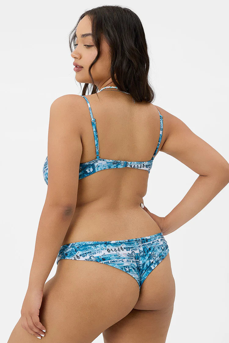 A simple yet stunning cheeky cut with our all new Alana Blue graphic print. Alana O'Herlihy designed this graphic print reminiscent of growing up in Malibu alongside our founder and creative director, Francesca Aiello. The Marina Bikini Bottom is designed with a figure-hugging fit, a back center seam, pink heart and star rhinestones, and our glistening shine fabric. Pair the Marina bikini bottom back with any of our Alana Blue Tops for a full summer set.